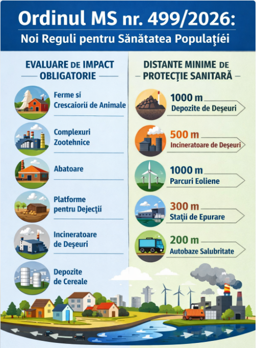 Actul normativ introduce clarificări importante privind evaluarea impactului asupra sănătății populației și stabilește distanțe minime de protecție sanitară pentru o serie de activități economice sau infrastructuri care pot genera disconfort sau riscuri pentru comunități.